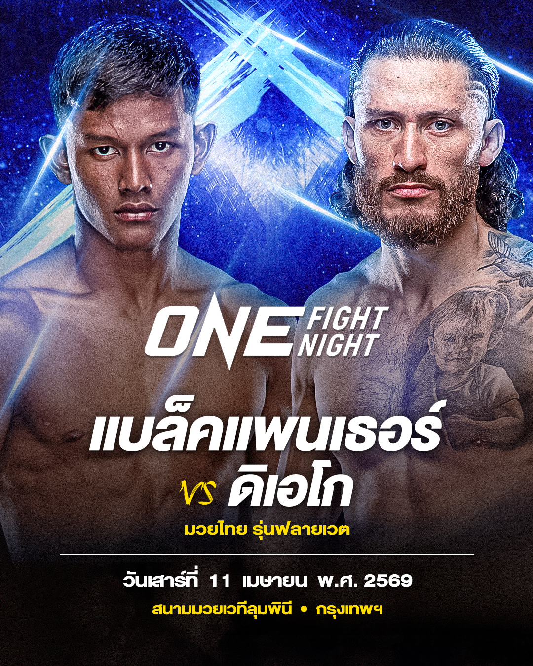 ติดตาม “แบล็คแพนเธอร์ vs ดิเอโก” ศึก ONE Fight Night 42: เชส vs จาบีร์ ถ่ายทอดสดจากสนามมวยเวทีลุมพินี (รามอินทรา) วันเสาร์ที่ 11 เม.ย. 69 จองบัตรเข้าชมในสนามผ่านทาง THAI TICKET MAJOR คู่แรกเริ่มเวลา 08.00 น.