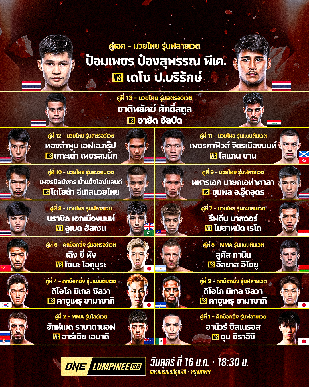 ติดตาม “ชาติพยัคฆ์ vs อายัด” ศึก ONE ลุมพินี 138 ถ่ายทอดสดจากสนามมวยเวทีลุมพินี (รามอินทรา) วันศุกร์ที่ 16 ม.ค.นี้ แฟนกีฬาการต่อสู้ชาวไทยสามารถจองบัตรเข้าชมในสนามผ่านทาง THAI TICKET MAJOR คู่แรกเริ่มเวลา 18.30 น.