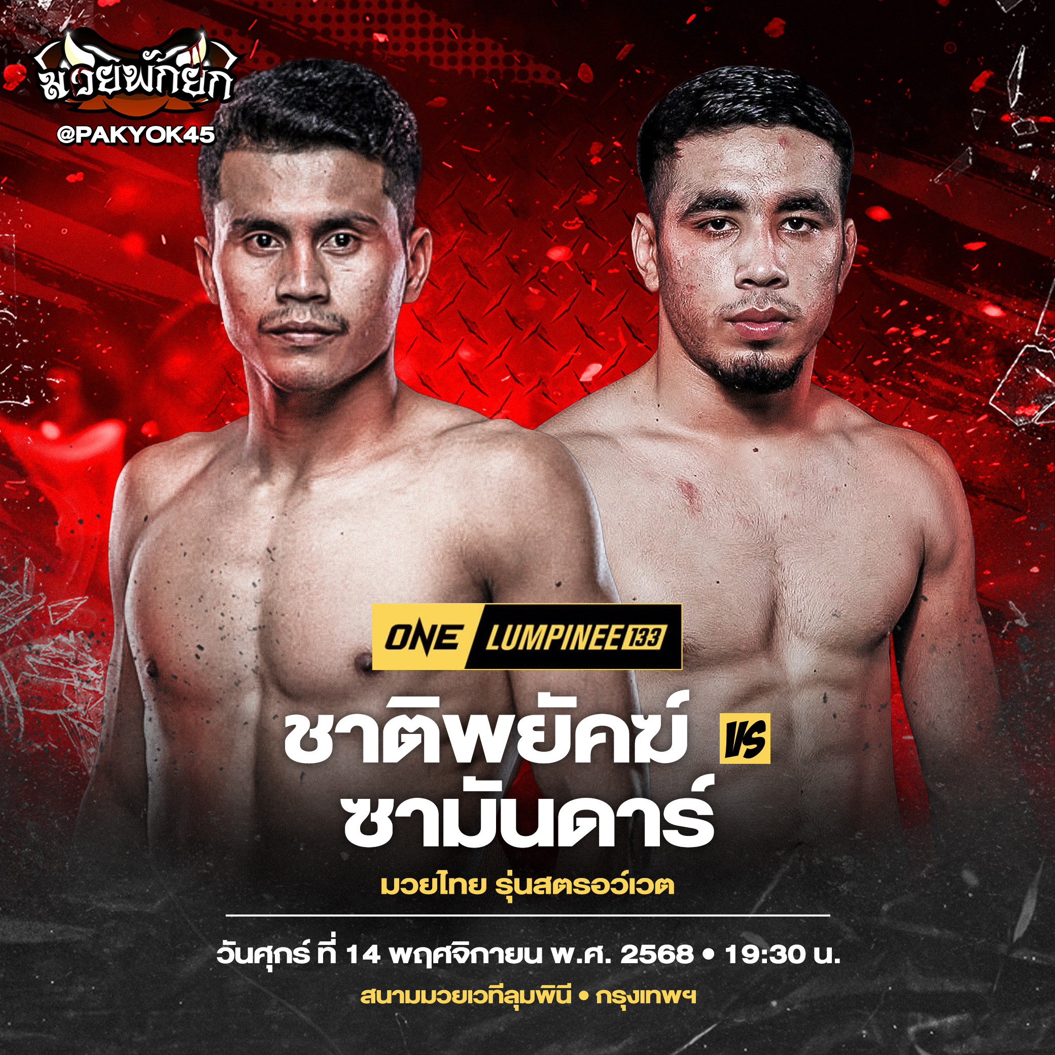อัปเดตคู่มวยมันพร้อมบู๊สนั่นในศึก ONE ลุมพินี 133 ที่จะเปิดฉากขึ้นในวันศุกร์ที่ 14 พ.ย. นี้ ล่าสุดเผยโฉมคู่เอกภาคอินเตอร์ของรายการ เป็นการพบกันระหว่าง “ชาติพยัคฆ์ ศักดิ์สตูล” จอมบู๊สายแข็ง วัย 27 ปี จากสตูล ปะทะ “ซามันดาร์ คาซานอฟ” มวยหนุ่มหน้าใหม่ วัย 19 ปี จากอุซเบกิสถาน ในกติกามวยไทย รุ่นสตรอว์เวต (115-125 ป.)