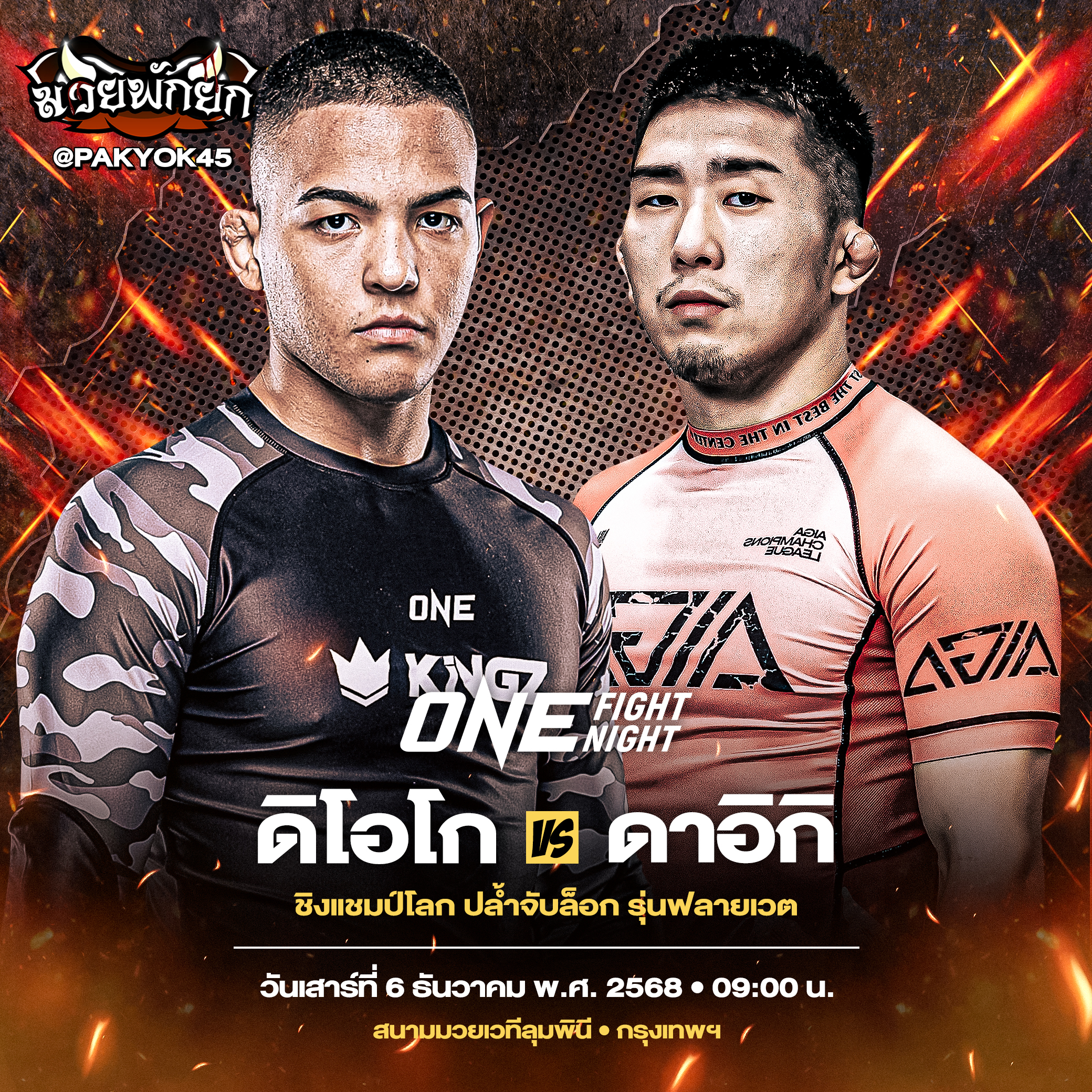 ศึกครั้งนี้ “ดิโอโก” หรือ “ดาอิกิ” ต่างพร้อมทุ่มสุดตัวเพื่อแย่งกันจารึกชื่อลงบนหน้าประวัติศาสตร์ในฐานะแชมป์โลก ONE ปล้ำจับล็อก รุ่นฟลายเวต คนต่อไป สุดท้ายใครจะสามารถคว้าเข็มขัดอันทรงเกียรติมาครองได้สำเร็จ แฟนกีฬาการต่อสู้ทั่วประเทศห้ามพลาดเด็ดขาด!
