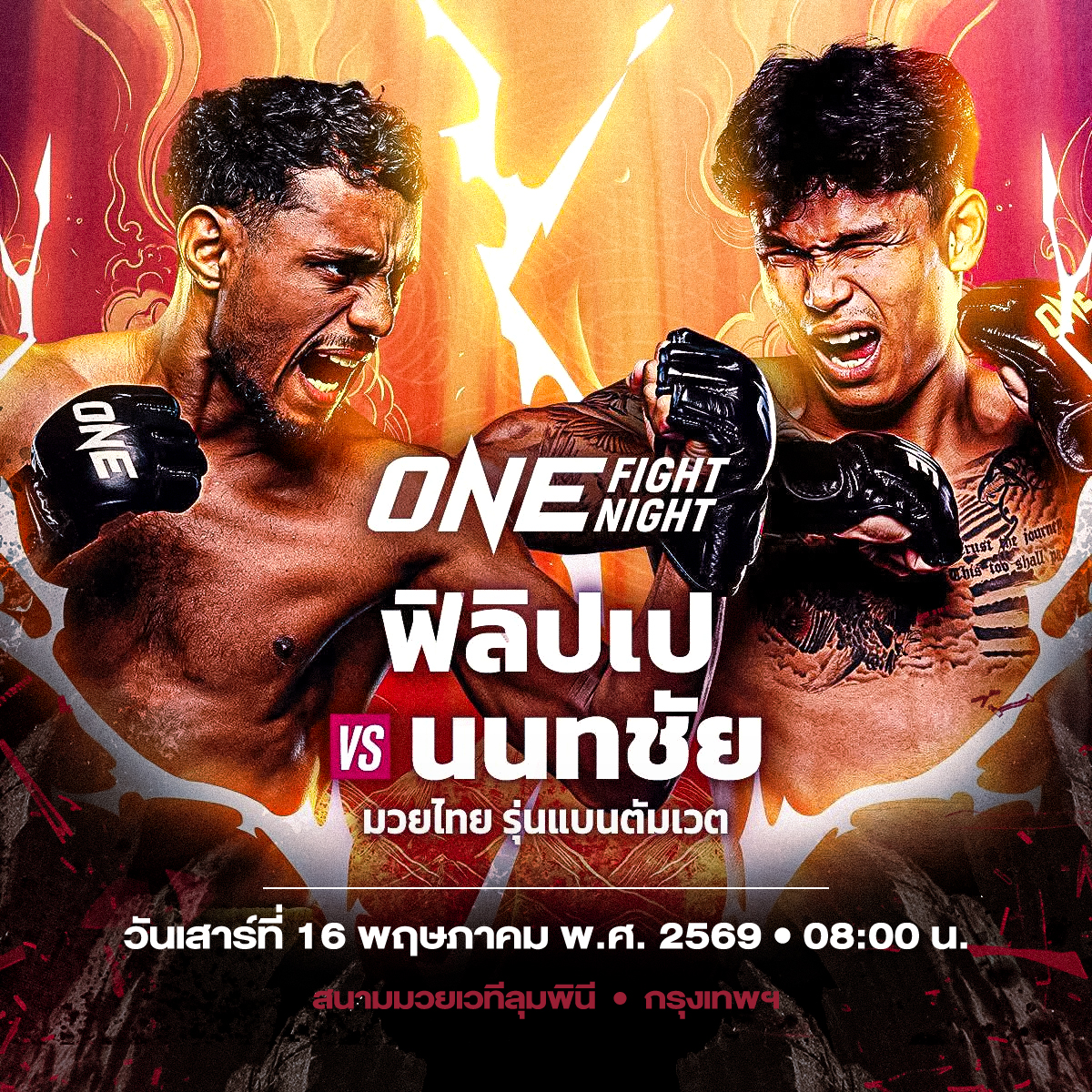 ประกาศอย่างเป็นทางการ สำหรับอีกหนึ่งคู่เดือดในศึก ONE Fight Night 43: ถัง ไค vs ชามิล โดยเป็นการโคจรมาปะทะกันของสองนักสู้สายเดือดระหว่าง “ฟิลิปเป โลโบ” มวยหมัดดุ วัย 32 ปี จากบราซิล และ “นนทชัย จิตรเมืองนนท์” มวยแข้งโหด วัย 26 ปี จากชุมพร เปิดศึกแข่งขันภายใต้กติกามวยไทย รุ่นแบนตัมเวต (135-145 ป.) วันเสาร์ที่ 16 พ.ค. 69 ถ่ายทอดสดจากสนามมวยเวทีลุมพินี (รามอินทรา) ในช่วงไพรม์ไทม์อเมริกา ซึ่งตรงกับช่วงเช้าเวลา 08.00 น.