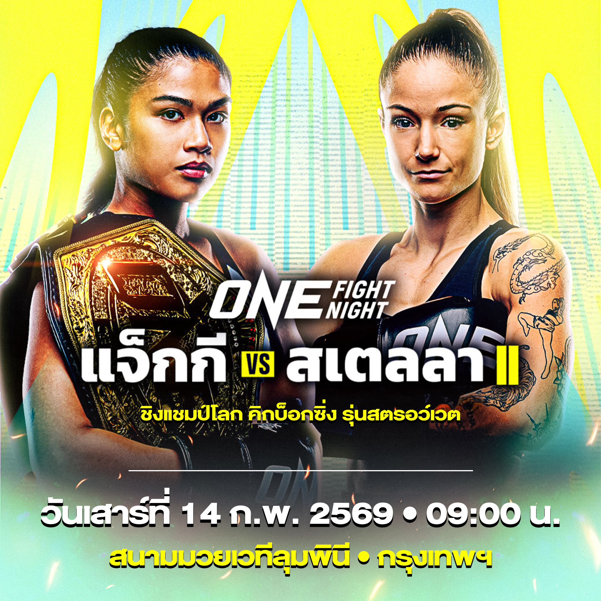 ONE มอบความตื่นเต้นเร้าใจต้อนรับวันวาเลนไทน์ในศึก ONE Fight Night 40 ที่จะถ่ายทอดสดจากสนามมวยเวทีลุมพินี (รามอินทรา) ในช่วงไพรม์ไทม์อเมริกา ซึ่งตรงกับช่วงเช้าเวลา 09.00 น. ในวันเสาร์ที่ 14 ก.พ. 69 โดยจัดศึกรีแมตช์เดือดระหว่าง “แจ็กกี บุนตัน” แชมป์โลก ONE คิกบ็อกซิ่ง รุ่นสตรอว์เวต (115-125 ป.) จากสหรัฐอเมริกา ป้องกันตำแหน่งจากคู่ปรับเก่า “สเตลลา เฮเมตซ์เบอร์เกอร์” แชมป์โลก ONE มวยไทย รุ่นเดียวกัน จากออสเตรีย ที่ข้ามสายมาล่าเข็มขัดเส้นที่สอง