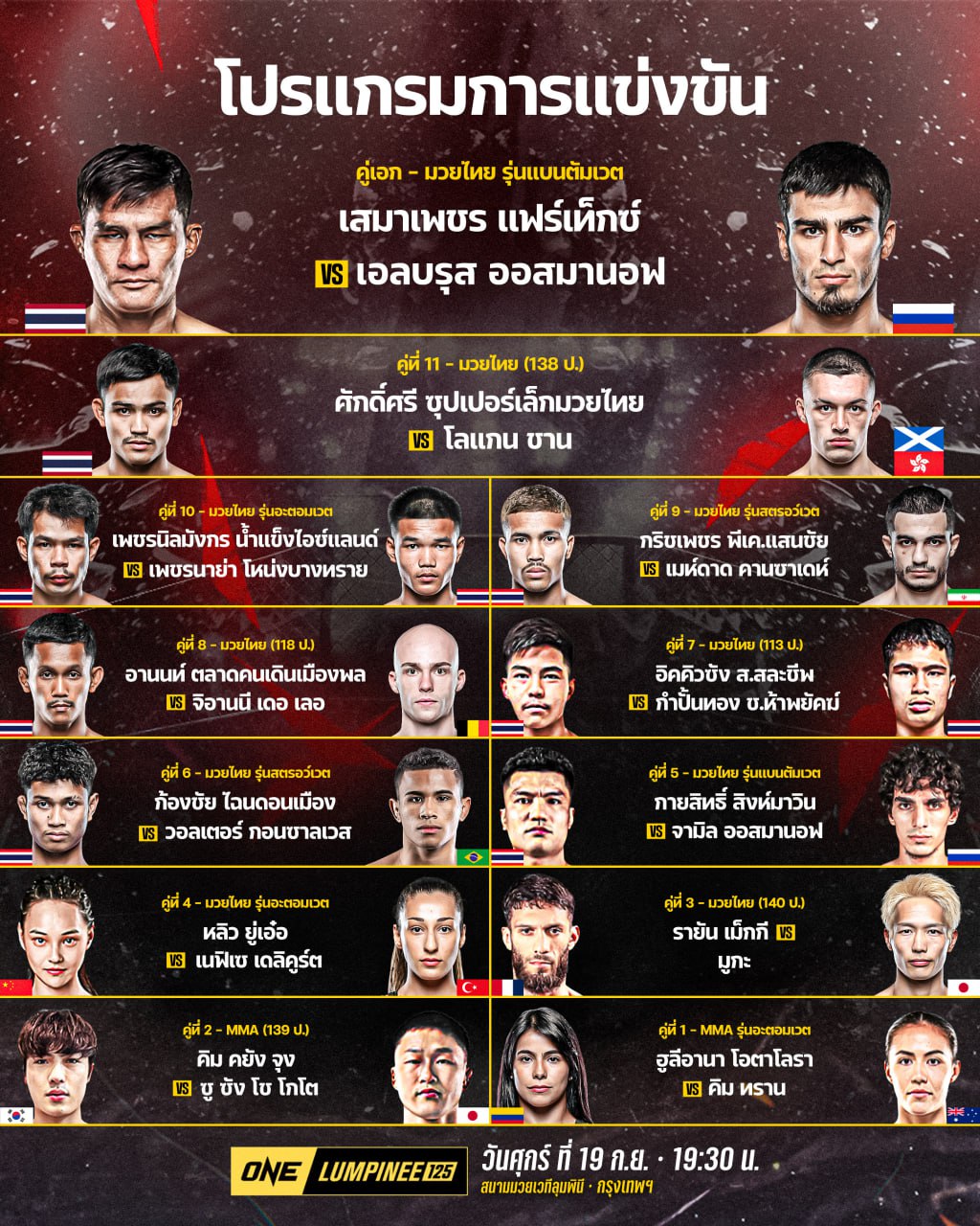 ติดตาม “ก้องชัย vs วอลเตอร์” ศึก ONE ลุมพินี 125 ถ่ายทอดสดจากสนามมวยเวทีลุมพินี (รามอินทรา) วันศุกร์ที่ 19 ก.ย.นี้ แฟนกีฬาการต่อสู้ชาวไทยสามารถจองบัตรเข้าชมในสนามผ่านทาง THAI TICKET MAJOR คู่แรกเริ่มเวลา 19.30 น.