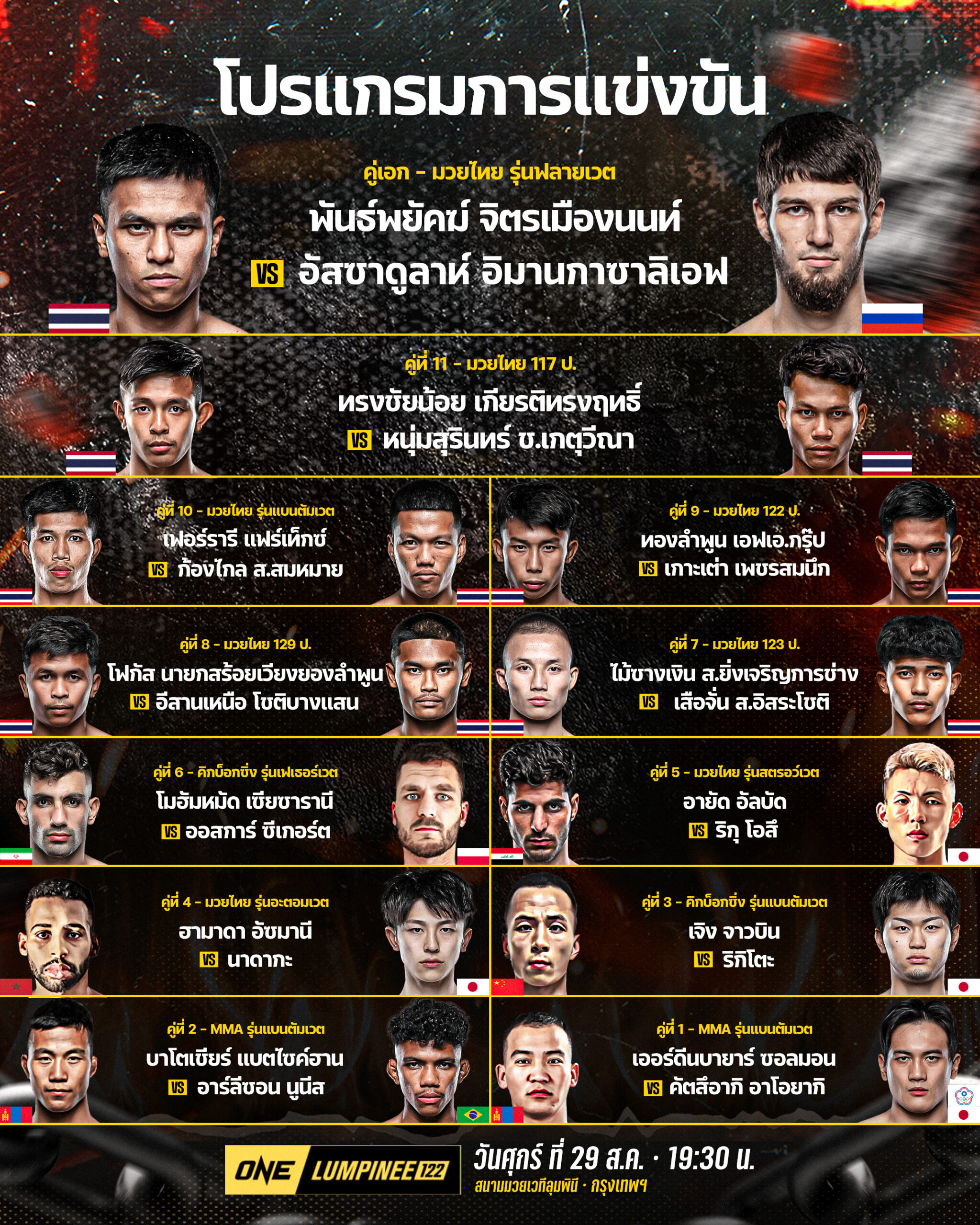 ติดตาม “เฟอร์รารี vs ก้องไกล” ศึก ONE ลุมพินี 122 ถ่ายทอดสดจากสนามมวยเวทีลุมพินี (รามอินทรา) วันศุกร์ที่ 29 ส.ค.นี้ แฟนกีฬาการต่อสู้ชาวไทยสามารถจองบัตรเข้าชมในสนามผ่านทาง THAI TICKET MAJOR คู่แรกเริ่มเวลา 19.30 น