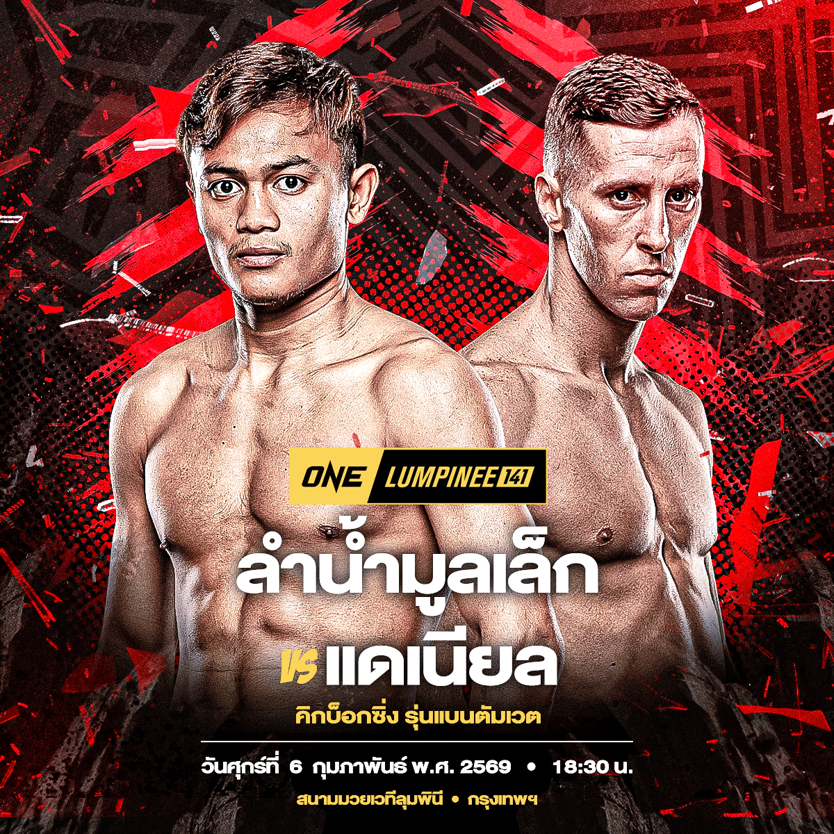 ศึก ONE ลุมพินี 141 ถ่ายทอดสดจากสนามมวยเวทีลุมพินี (รามอินทรา) วันศุกร์ที่ 6 ก.พ. 69 จองบัตรเข้าชมในสนามผ่านทาง THAI TICKET MAJOR คู่แรกเริ่มเวลา 18.30 น.