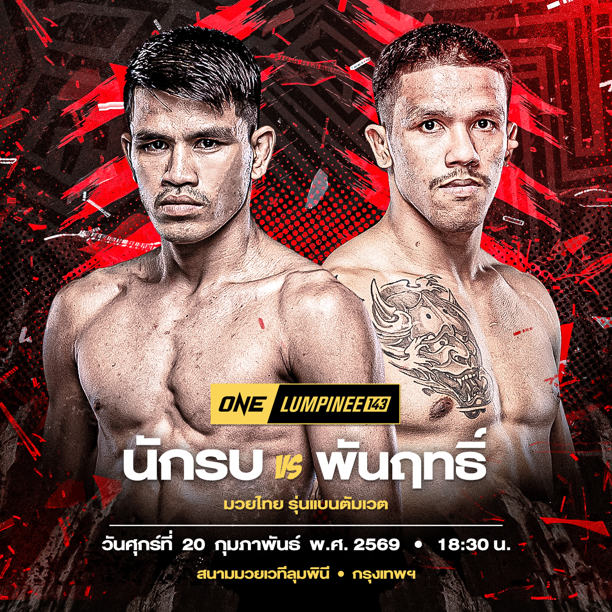 ศึก ONE ลุมพินี 143 ถ่ายทอดสดจากสนามมวยเวทีลุมพินี (รามอินทรา) วันศุกร์ที่ 20 ก.พ.นี้ เริ่มการแข่งขันเวลา 18.30 น. สามารถจองบัตรเข้าชมในสนามผ่านทาง THAI TICKET MAJOR