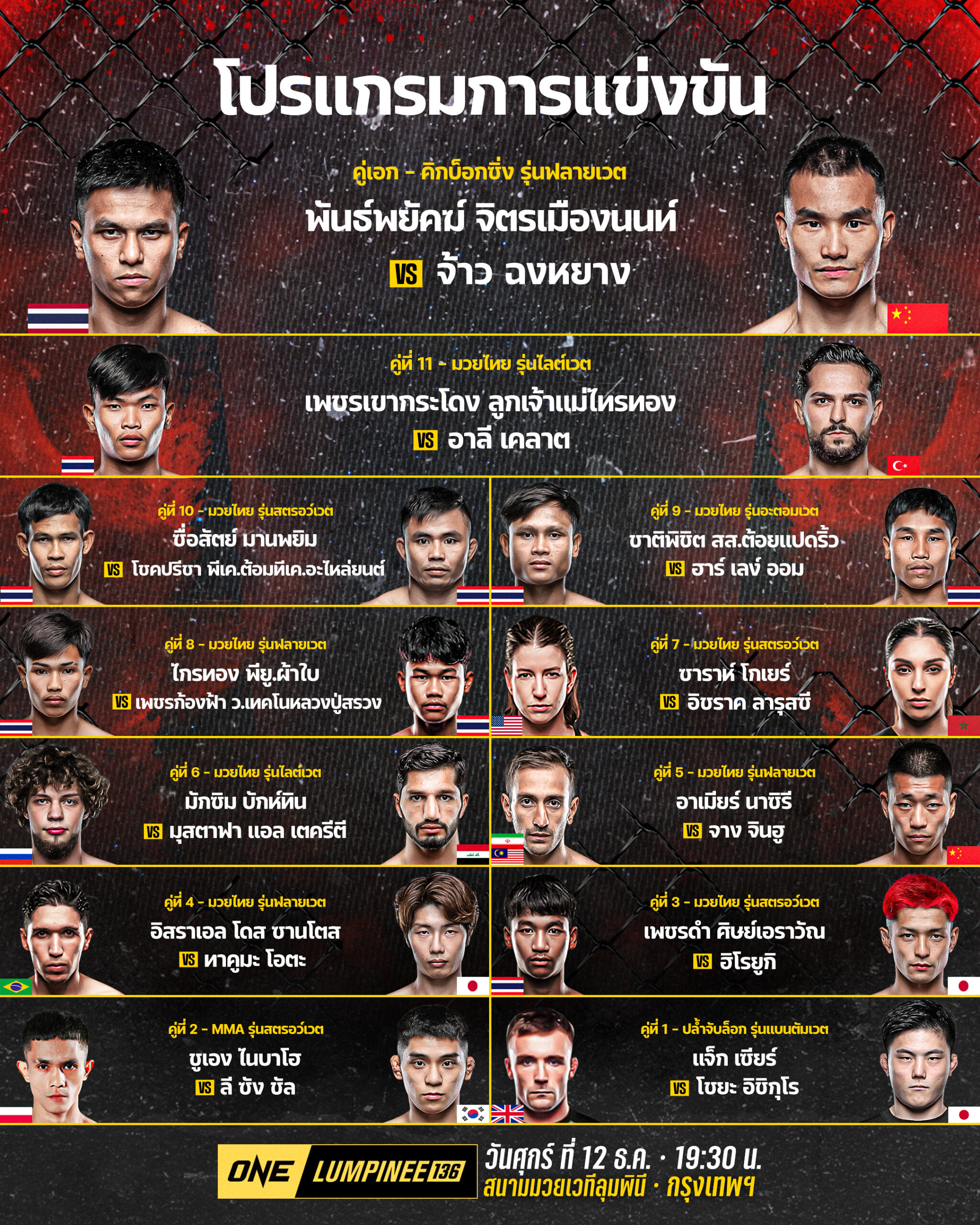 โปรแกรมการแข่งขันทุกคู่ศึก ONE ลุมพินี 136