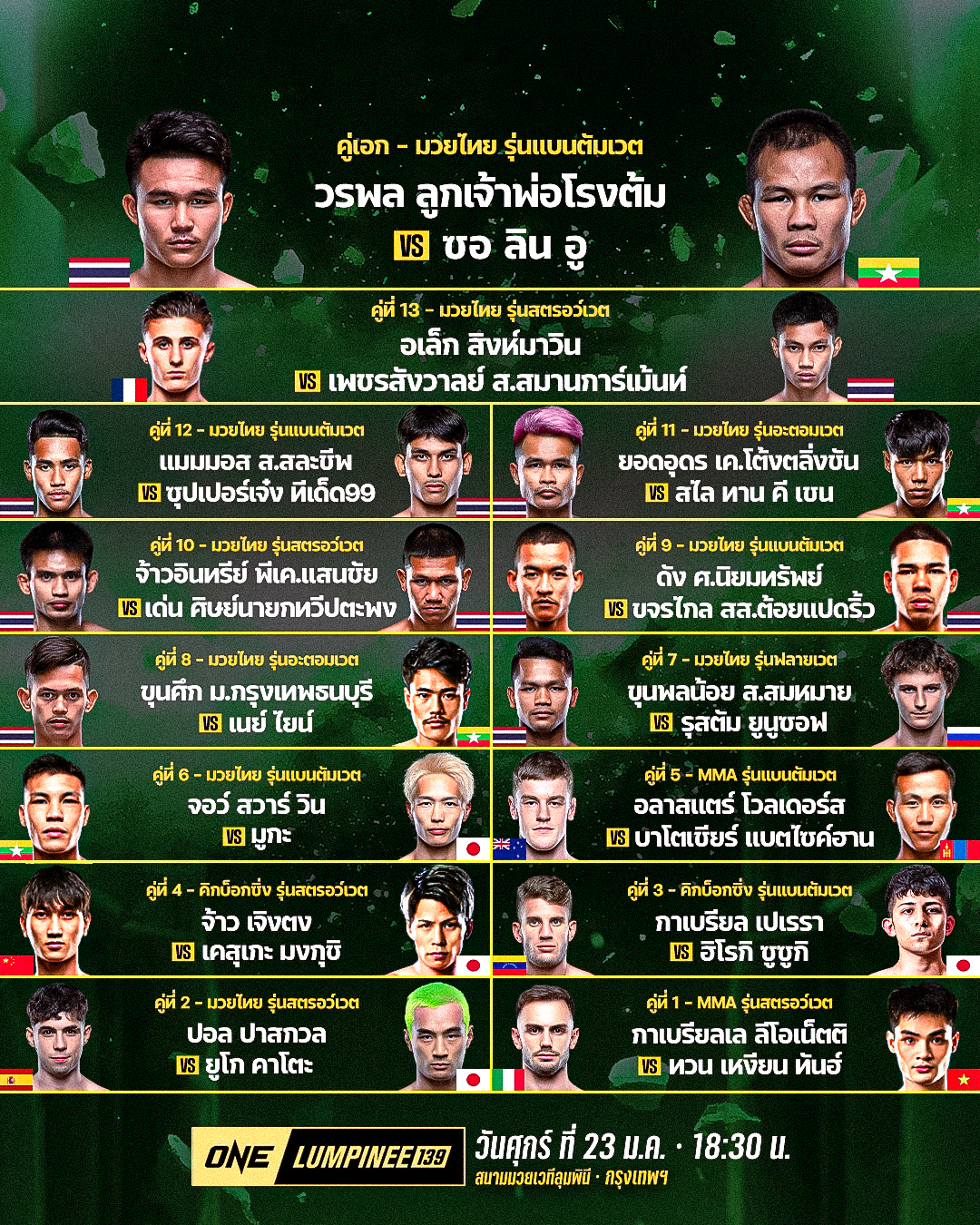 โปรแกรมการแข่งขันทุกคู่ศึก ONE ลุมพินี 139