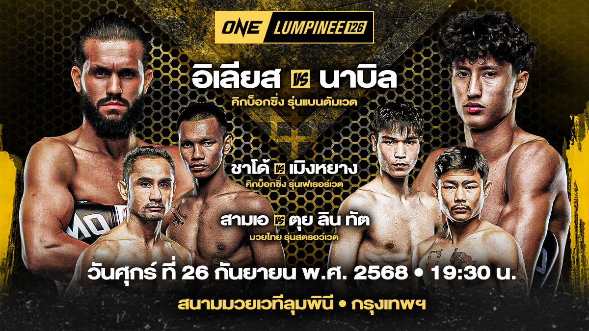 สัปดาห์ต่อไปเตรียมตัวให้พร้อม สนุกไปกับศึกใหญ่ ONE ลุมพินี 126 วันศุกร์ที่ 26 ก.ย.นี้ โดยคู่เอก “อิเลียส เอ็นนาฮาชิ” จอมบู๊ไร้พ่ายใน ONE ตัวแทนเนเธอร์แลนด์-โมร็อกโก พบกับ “นาบิล อานาน” แชมป์โลก ONE มวยไทย รุ่นแบนตัมเวต (135-145 ป.) ที่สลับมาสู้คิกบ็อกซิ่งครั้งแรกในรายการ