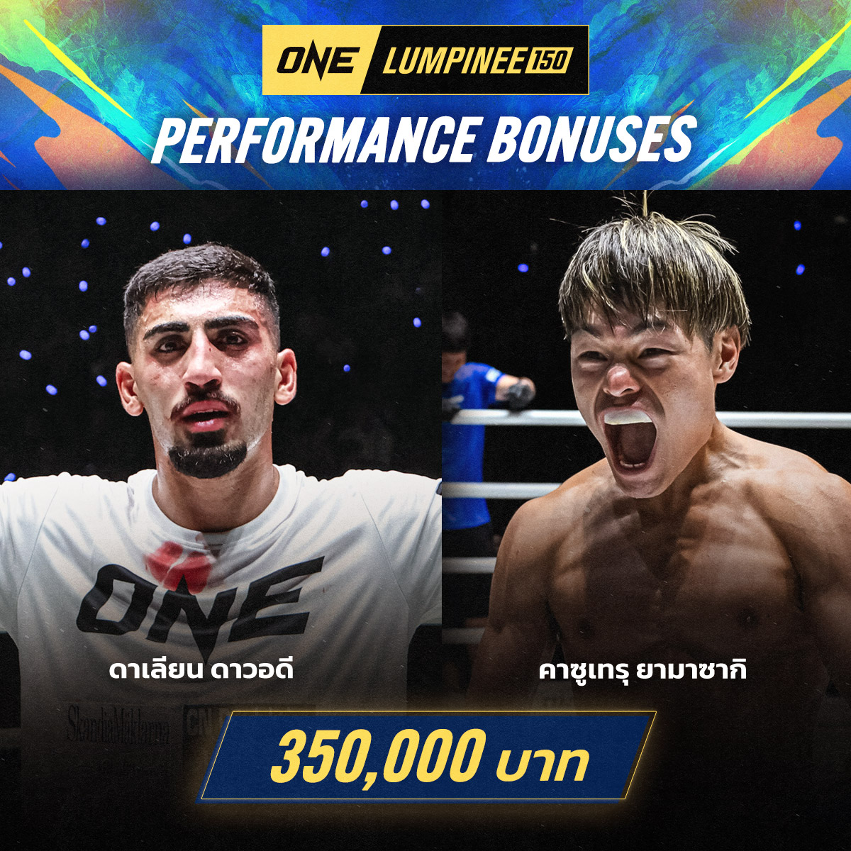 การแข่งขันของค่ำคืนนี้อัดแน่นด้วยเกมคุณภาพ ปรากฏว่ามีนักสู้ 4 ราย โชว์ลีลาปิดเกมโดดเด่นเข้าตา บิ๊กบอส “ชาตรี ศิษย์ยอดธง” สั่งมอบเงินรางวัลโบนัสพิเศษให้ทันทีคนละ 350,000 บาท ไม่รวมค่าตัว รวมยอดเงินทั้งสิ้น 1,400,000 บาท (หนึ่งล้านสี่แสนบาท) ได้แก่ “โคตะ อาเบะ”, “เพชรหนึ่ง” ไอแซค โมฮัมเหม็ด ในช่วง The Inner Circle และ “คาซูเทรุ ยามาซากิ”, “ดาเลียน ดาวอดี” ในการแข่งขันศึก ONE ลุมพินี 150