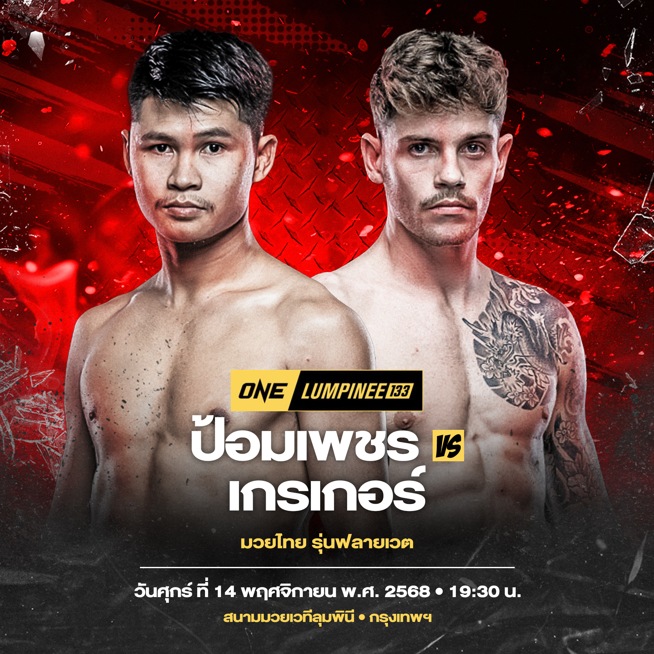 เปิดโผความมันเอาใจสายบู๊ สำหรับศึก ONE ลุมพินี 133 วันศุกร์ที่ 14 พ.ย.นี้ ล่าสุดเปิดตัวคู่เอกของรายการ เป็นการดวลเดือดระหว่าง “ป้อมเพชร พานทองยิม” นักสู้ใจเด็ด วัย 27 ปี จากบุรีรัมย์ ปะทะ “เกรเกอร์ ทอม” กำปั้นขาลุย วัย 25 ปี จากสกอตแลนด์ ในกติกามวยไทย รุ่นฟลายเวต (125-135 ป.)