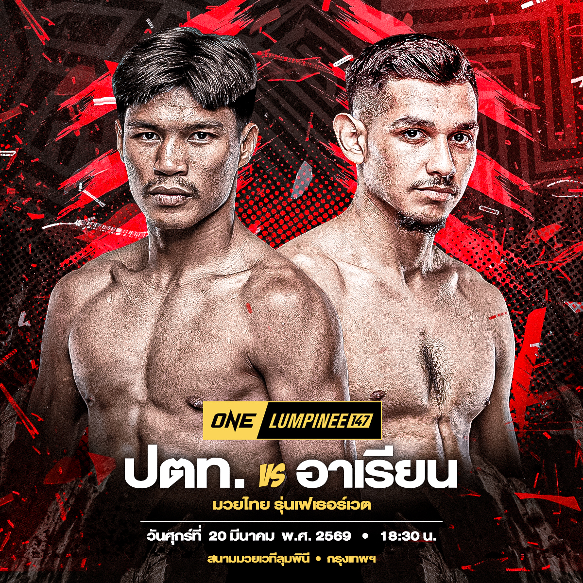 ติดตาม “ปตท. vs อาเรียน” ศึก ONE ลุมพินี 147 ถ่ายทอดสดจากสนามมวยเวทีลุมพินี (รามอินทรา) วันศุกร์ที่ 20 มี.ค. นี้ เริ่มการแข่งขันเวลา 18.30 น.
