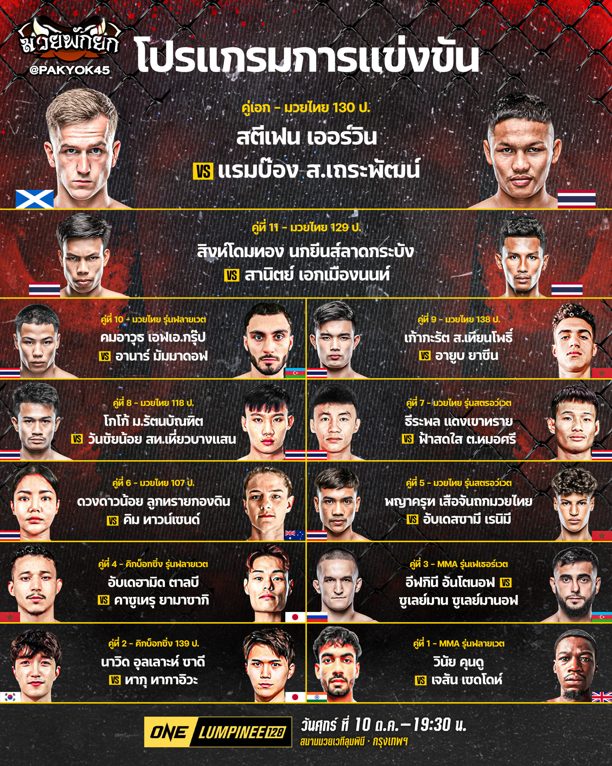 ติดตาม “สตีเฟน vs แรมบ๊อง” ศึก ONE ลุมพินี 128 ถ่ายทอดสดจากสนามมวยเวทีลุมพินี (รามอินทรา) วันศุกร์ที่ 10 ต.ค.นี้ แฟนกีฬาการต่อสู้ชาวไทยสามารถจองบัตรเข้าชมในสนามผ่านทาง THAI TICKET MAJOR คู่แรกเริ่มเวลา 19.30 น.