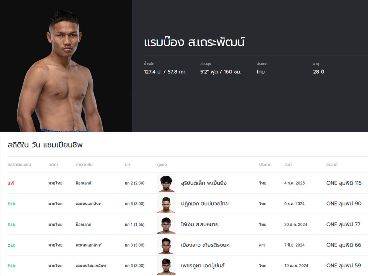 อย่างไรก็ตาม ในไฟต์ล่าสุดที่เจ้าตัวได้รับโอกาสขึ้นป้ายคู่เอกนำรายการเป็นครั้งแรกกลับไม่สามารถโชว์ฟอร์มได้อย่างที่หวัง พลาดท่าโดนหมัดของ “สุริยันต์เล็ก พ.เย็นยิ่ง” น็อกหลับคาเชือกไปในช่วงปลายยกสอง ในศึก ONE ลุมพินี 115 เมื่อเดือน ก.ค. ที่ผ่านมา ทำให้หยุดสถิติไร้พ่ายไว้เพียงเท่านั้น ซึ่งเป็นความพ่ายแพ้เป็นครั้งแรกในรอบเกือบ 2 ปีที่ชกบนเวทีนี้ โดยปัจจุบัน “แรมบ๊อง” ครองสถิติชนะ 8 จาก 11 ไฟต์