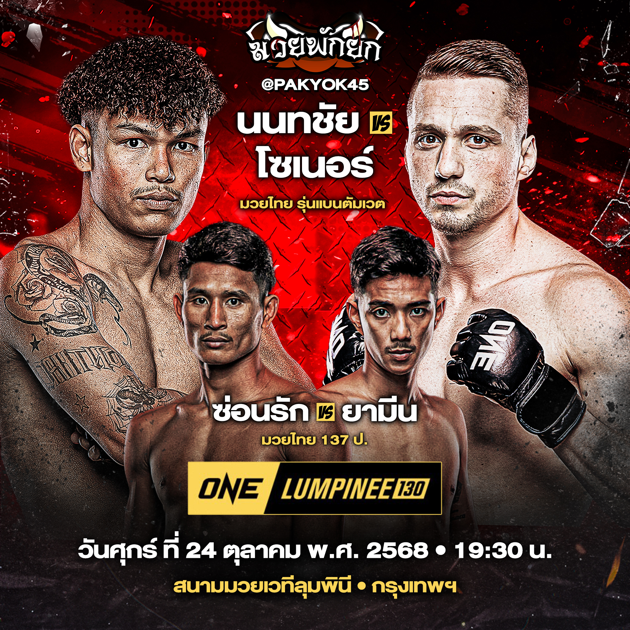 สัปดาห์ต่อไปสนุกกันแบบไม่มีพักในศึก ONE ลุมพินี 130 วันศุกร์ที่ 24 ต.ค.นี้ โดยคู่เอก “นนทชัย จิตรเมืองนนท์” ลดเวตลงมาชน “โซเนอร์ เซน” จากตุรกี ในกติกามวยไทย รุ่นแบนตัมเวต (135-145 ป.)