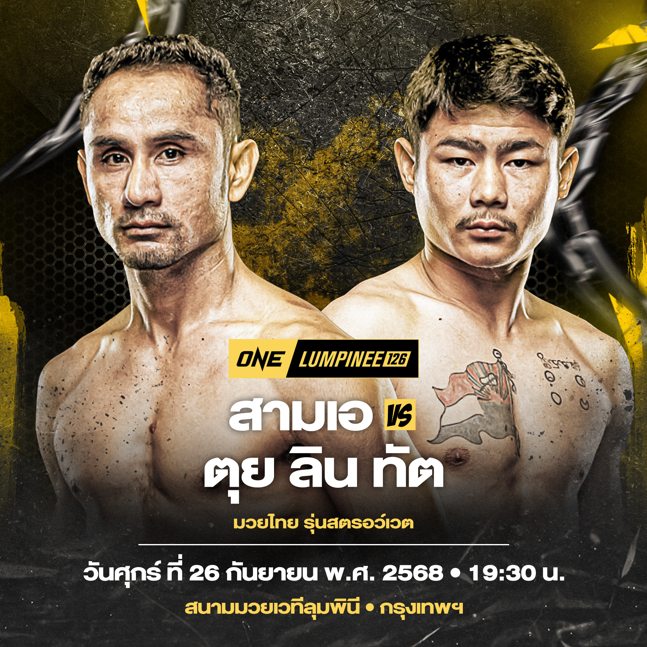 ติดตาม “สามเอ vs ตุย ลิน ทัต” ศึก ONE ลุมพินี 126 ถ่ายทอดสดจากสนามมวยเวทีลุมพินี (รามอินทรา) วันศุกร์ที่ 26 ก.ย.นี้ ส่วนบัตรเข้าชมในสนามจำหน่ายหมดแล้ว