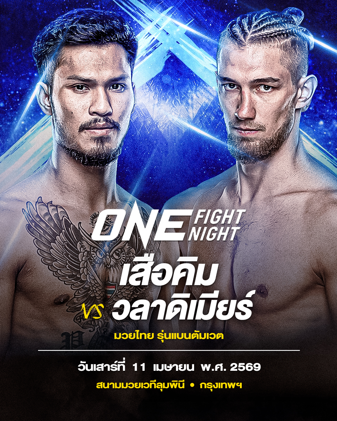 ติดตาม “เสือคิม vs วลาดิเมียร์” ในศึก ONE Fight Night 42: เชส vs จาบีร์ ถ่ายทอดสดจากสนามมวยเวทีลุมพินี (รามอินทรา) วันเสาร์ที่ 11 เม.ย. 69 จองบัตรเข้าชมในสนามผ่านทาง THAI TICKET MAJOR คู่แรกเริ่มเวลา 08.00 น.