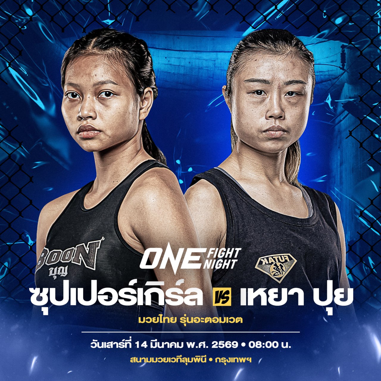 เตรียมต้อนรับการคัมแบ็กของสองกำปั้นสาวในศึก ONE Fight Night 41: อัลลิเซีย vs เพชรจีจ้า ที่จะเปิดฉากขึ้นในวันเสาร์ที่ 14 มี.ค. 69 ถ่ายทอดสดจากสนามมวยเวทีลุมพินี (รามอินทรา) ในช่วงไพรม์ไทม์อเมริกา ตรงกับช่วงเช้าเวลา 08.00 น. ตามเวลาประเทศไทย โดย “แอนนา ซุปเปอร์เกิร์ล” มวยสาวเข่าดุ วัย 22 ปี หวังเรียกคืนศรัทธา ขึ้นดวลเดือดกับภายใต้กติกามวยไทย รุ่นอะตอมเวต (105 – 115 ป.) กับ “หยู เหยา ปุย” นักสู้สาวจากฮ่องกง วัย 32 ปี ที่ต้องการชัยชนะหลังแพ้สองไฟต์รวด