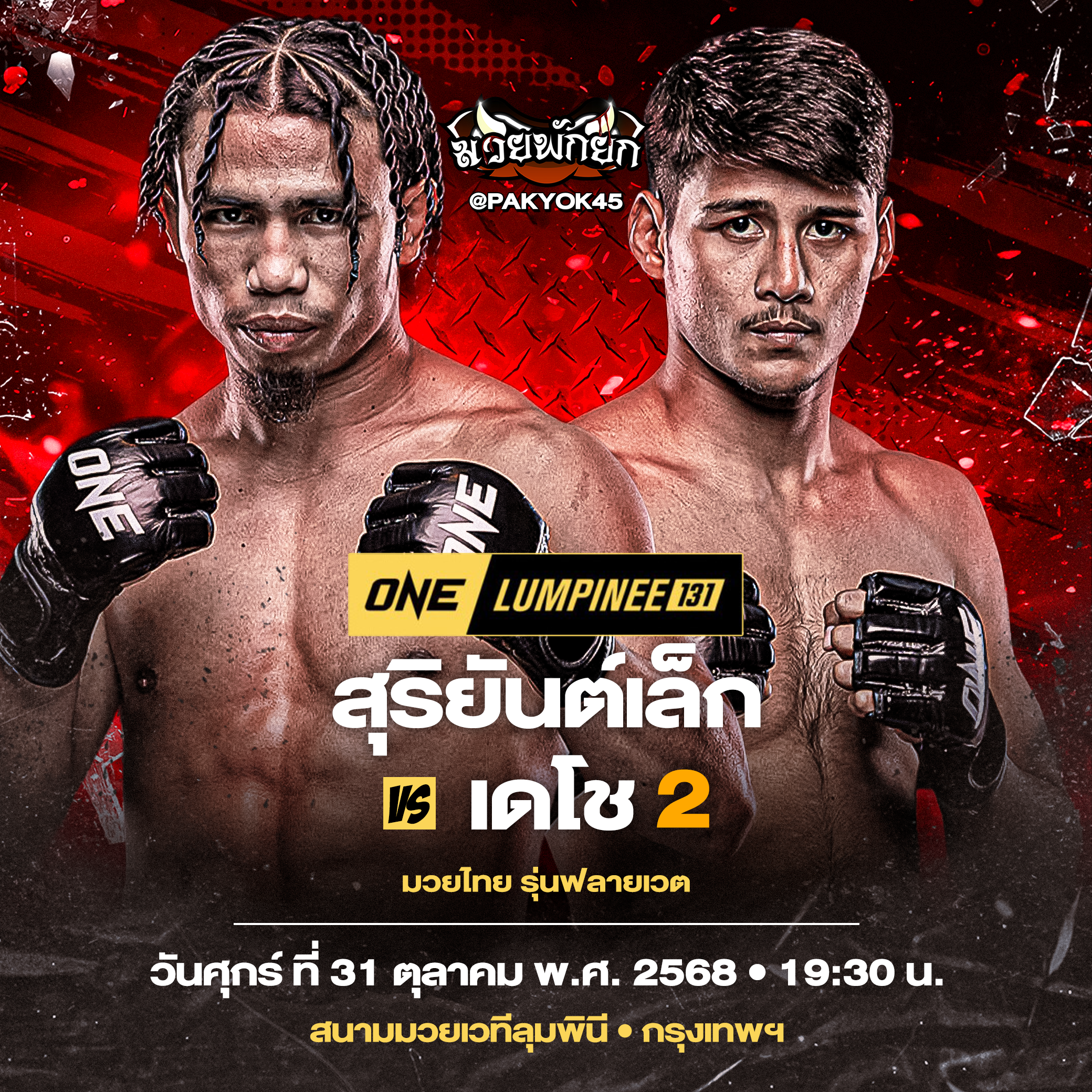 เปิดโผความเดือดปิดท้ายเดือนสิบ ในศึก ONE ลุมพินี 131 วันศุกร์ที่ 31 ต.ค.นี้ โดย “สุริยันต์เล็ก พ.เย็นยิ่ง” นักชกหมัดหนัก วัย 29 ปี จากมหาสารคาม เตรียมรีแมตช์ภาคสองกับคู่ปรับเก่า “เดโช ป.บริรักษ์” มวยครบเครื่อง วัย 22 ปี จากสงขลา ในกติกามวยไทย รุ่นฟลายเวต (125-135 ป.)