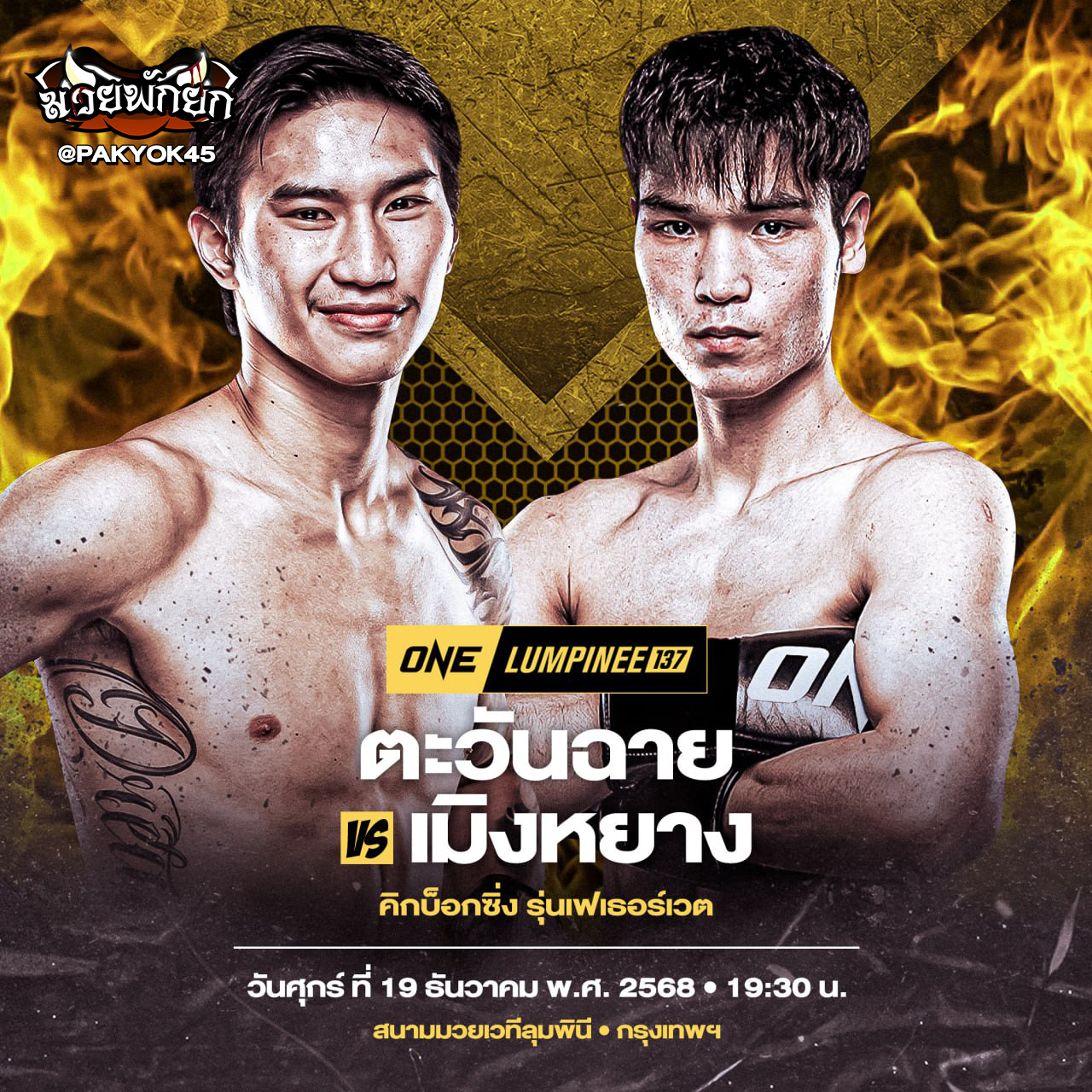 เผยโฉมคู่เอกศึก ONE ลุมพินี 137 ที่จะระเบิดความมันขึ้นในวันศุกร์ที่ 19 ธ.ค.นี้ โดย “ตะวันฉาย พีเค.แสนชัย” แชมป์โลก ONE มวยไทย รุ่นเฟเธอร์เวต (145-155 ป.) จากชลบุรี สลัดอาการบาดเจ็บพร้อมหวนคืนสังเวียนกู้ศรัทธามหาชนอีกครั้ง พบกับ “หลิว เมิงหยาง” นักชกฝีมือฉกาจจากแดนมังกร ในกติกาคิกบ็อกซิ่ง รุ่นเฟเธอร์เวต