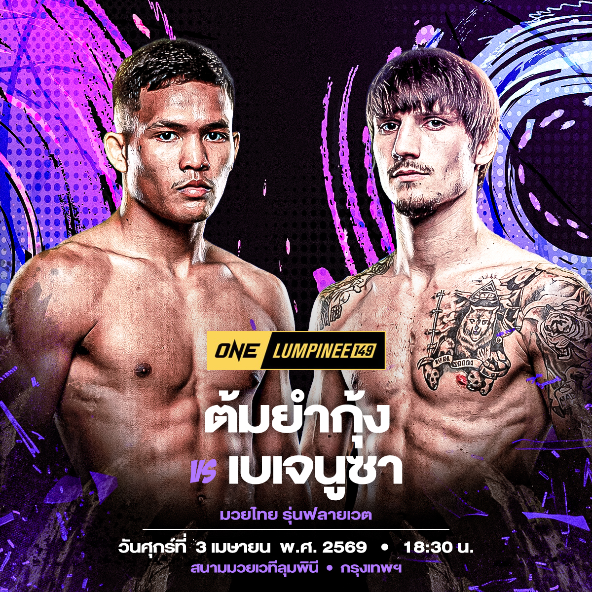 ติดตาม “ต้มยำกุ้ง vs เบเจนูซา” ศึก ONE ลุมพินี 149 วันศุกร์ที่ 3 เม.ย. นี้ จองบัตรเข้าชมในสนามผ่านทาง THAI TICKET MAJOR สำหรับผู้ชมทางบ้าน สามารถรับชมการถ่ายทอดสด ตั้งแต่เวลา 20.30 น. เป็นต้นไป