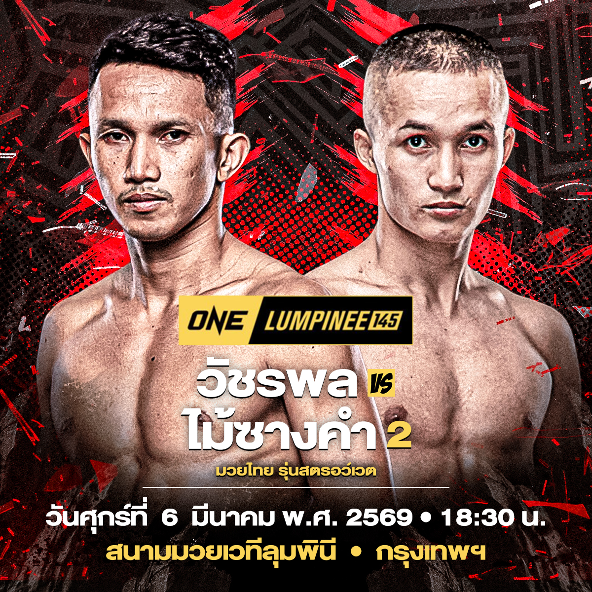 ONE ฝ่าทะลุองศาเดือด เปิดโปรแกรมเพิ่มเติมในศึก ONE ลุมพินี 145 วันศุกร์ที่ 6 มี.ค. นี้ โดยเปิดโอกาสให้สองจอมบู๊หมัดโหดได้มีโอกาสรีแมตช์กันระหว่าง “วัชรพล เหล่าโชคเจริญ” หรือชื่อเดิมคือ “วัชรพล พีเค.แสนชัย” นักสู้ขาลุย วัย 33 ปี จากนครราชสีมา ปะทะ “ไม้ซางคำ ส.ยิ่งเจริญการช่าง” กำปั้นอาวุธแน่น วัย 24 ปี จากแม่ฮ่องสอน ภายใต้กติกามวยไทย รุ่นสตรอว์เวต (115-125 ป.)