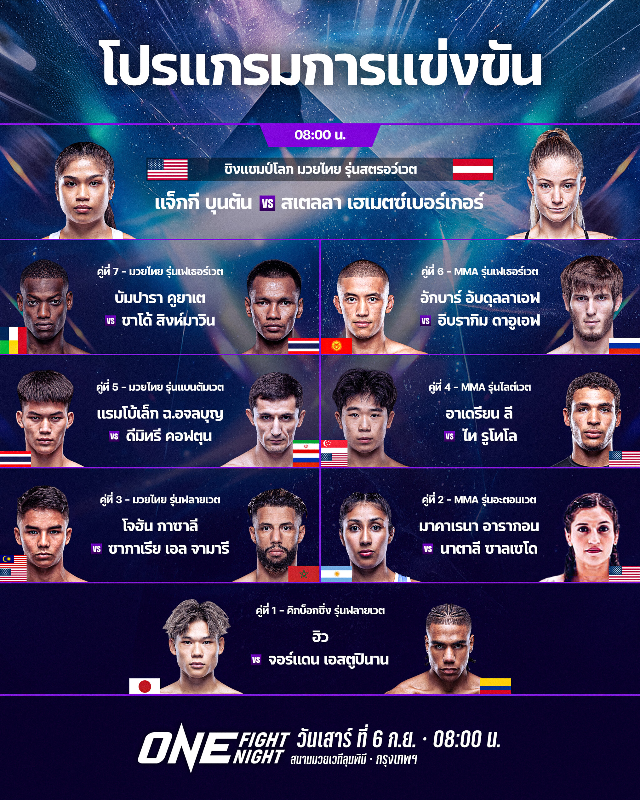 ศึก ONE Fight Night 35: แจ็กกี vs สเตลลา ถ่ายทอดสดจากสนามมวยเวทีลุมพินี (รามอินทรา) วันเสาร์ที่ 6 ก.ย. 68 จองบัตรเข้าชมในสนามผ่านทาง THAI TICKET MAJOR คู่แรกเริ่มเวลา 08.00 น.