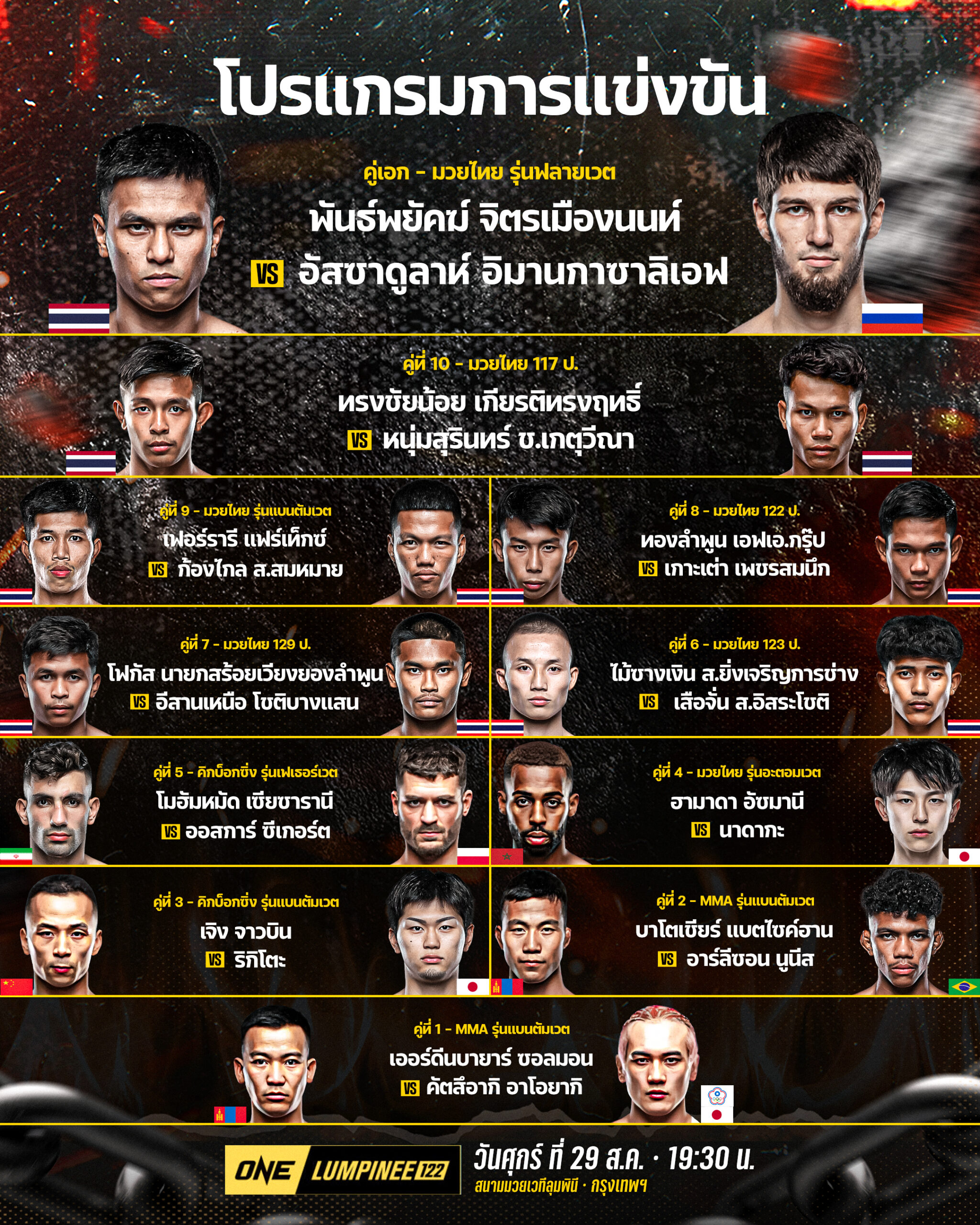 ONE พร้อมเสิร์ฟความสนุกแบบถึงใจให้กับแฟนกีฬาต่อสู้ในศึก ONE ลุมพินี 122 ที่นำทัพนักสู้ 22 คน มาปะทะฝีมือกัน ถ่ายทอดสดจากสนามมวยเวทีลุมพินี (รามอินทรา) ส่งออกไปยัง 195 ประเทศทั่วโลก ในวันศุกร์ที่ 29 ส.ค.นี้ เริ่มคู่แรก 19.30 น.