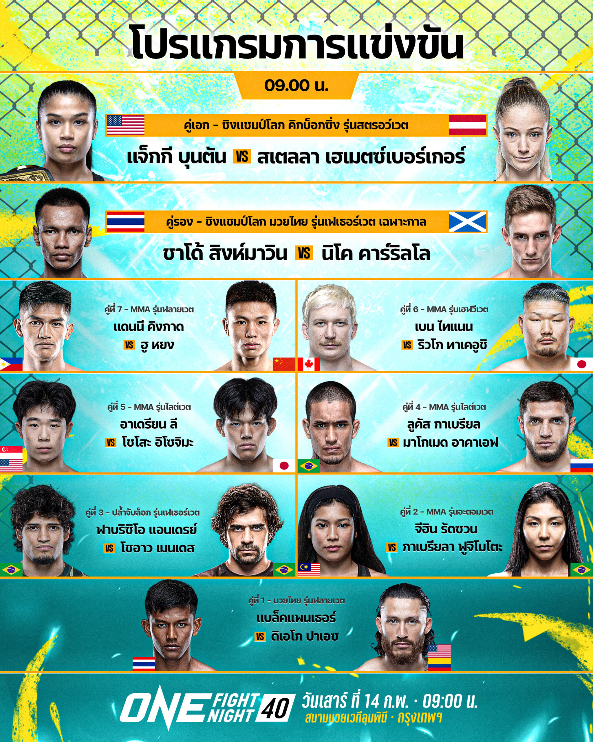 เตรียมพบกับความมันเต็มพิกัดฉลองวันแห่งความรักในศึก ONE Fight Night 40: แจ็กกี vs สเตลลา ll ที่จะถ่ายทอดสดไปยัง 195 ประเทศทั่วโลก จากสนามมวยเวทีลุมพินี (รามอินทรา) ในช่วงไพรม์ไทม์อเมริกา ซึ่งตรงกับช่วงเช้าเวลา 09.00 น. ในวันเสาร์ที่ 14 ก.พ.นี้