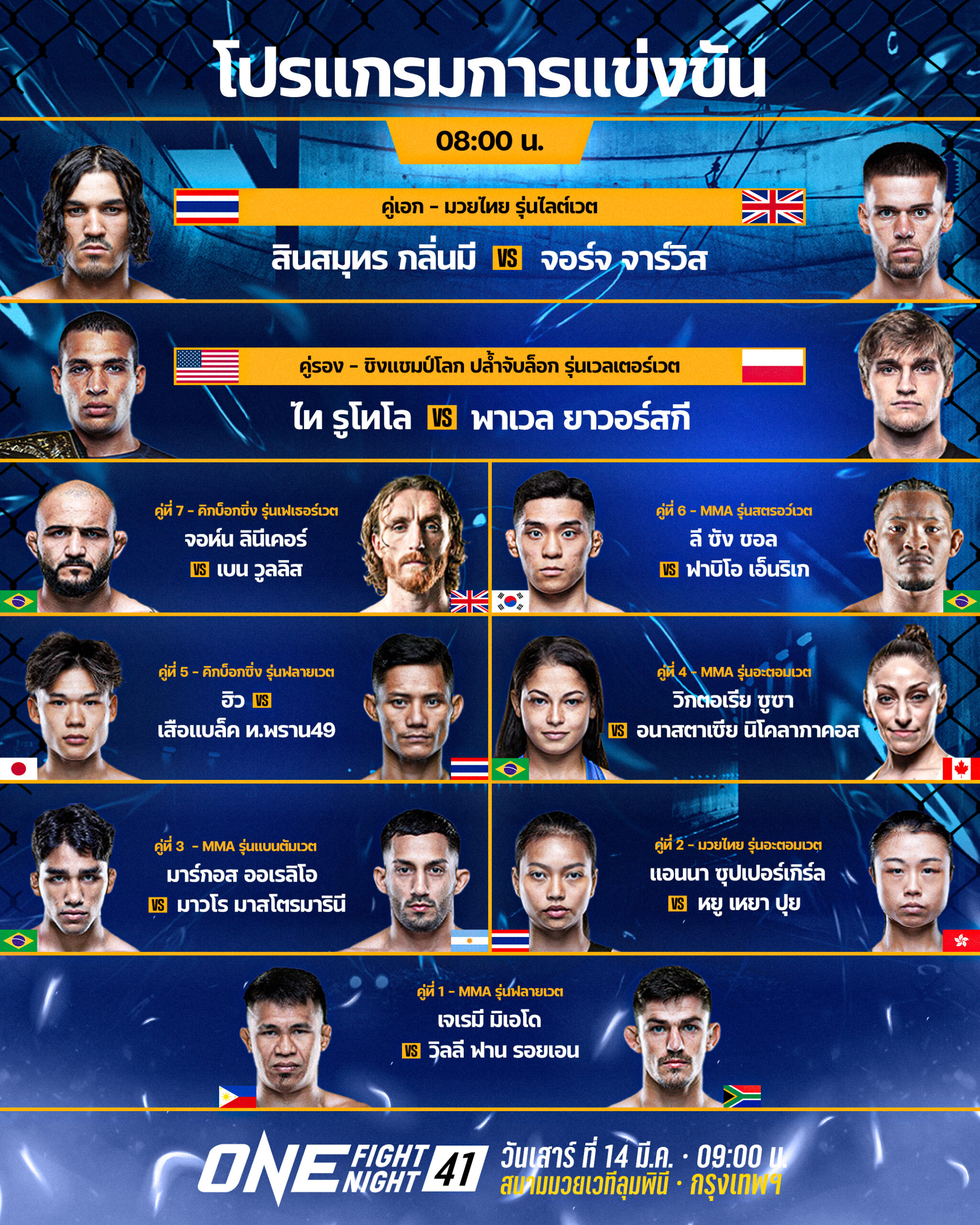 ศึก ONE Fight Night 41: สินสมุทร vs จอร์จ ถ่ายทอดสดจากสนามมวยเวทีลุมพินี (รามอินทรา) วันเสาร์ที่ 14 มี.ค. 69 จองบัตรเข้าชมในสนามผ่านทาง THAI TICKET MAJOR คู่แรกเริ่มเวลา 08.00 น.