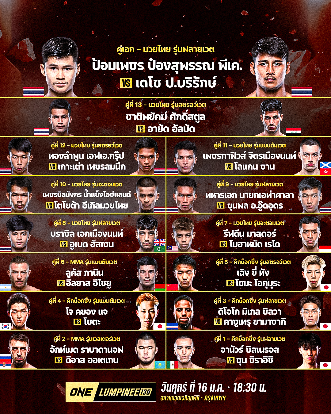 ONE เดินหน้ามอบความสนุกต้อนรับศักราชใหม่ให้กับแฟนกีฬาต่อสู้ในศึก ONE ลุมพินี 138 โดยขนนักสู้มากฝีมือมาดวลกันทั้งสิ้น 14 คู่ พร้อมถ่ายทอดสดไปยัง 195 ประเทศทั่วโลก จากสนามมวยเวทีลุมพินี (รามอินทรา) ในวันศุกร์ที่ 16 ม.ค.นี้ พร้อมปรับเวลาเริ่มคู่แรกเป็น 18.30 น.