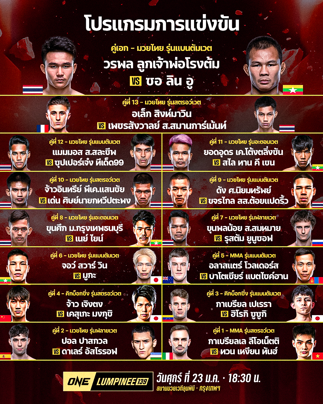 ONE เสิร์ฟความสนุกให้กับแฟนกีฬาศิลปะต่อสู้แบบไม่มีพัก ในศึก ONE ลุมพินี 139 โดยยกขบวนจอมบู๊แถวหน้ามาปะทะฝีมือกันทั้งสิ้น 14 คู่ พร้อมถ่ายทอดสดจากสนามมวยเวทีลุมพินี (รามอินทรา) ส่งออกไปยัง 195 ประเทศทั่วโลก ในวันศุกร์ที่ 23 ม.ค. นี้ เริ่มคู่แรกเวลา 18.30 น.