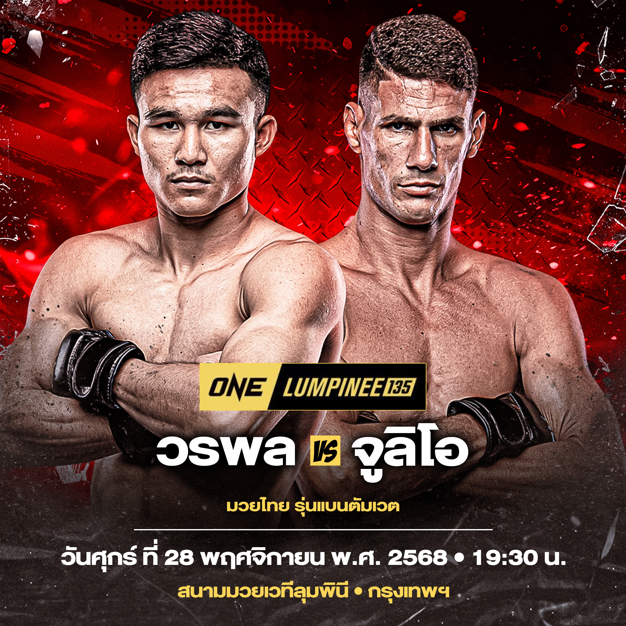 แง้มโปรแกรมเดือดล่วงหน้าสำหรับศึก ONE ลุมพินี 135 วันศุกร์ที่ 28 พ.ย.นี้ โดยเผยโฉมคู่เอกของรายการ เป็นการดวลอาวุธกันระหว่าง “วรพล ลูกเจ้าพ่อโรงต้ม” มวยซ้ายดุดัน วัย 23 ปี จากบุรีรัมย์ พบกับ “จูลิโอ โลโบ” กำปั้นสายแข็ง วัย 31 ปี จากบราซิล ในกติกามวยไทย รุ่นแบนตัมเวต (135-145 ป.)